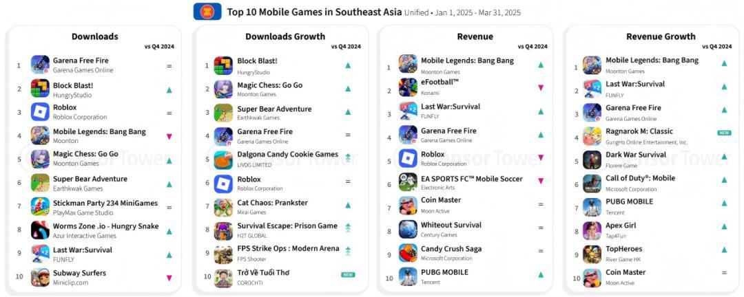 Sensor Towe发布的2025第一季度东南亚地区手游下载、收入TOP10排行榜,MLBB的收入榜位居第一,下载榜位列第四,甚至它的衍生产品MGCC在下载榜和下载增长榜单中都能排到了第5和第2。