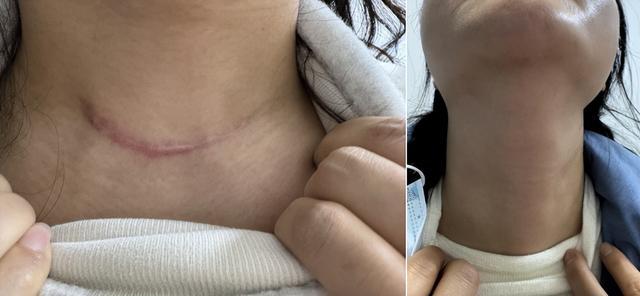 (▲传统开刀手术照片(左)与腔镜侧颈清术后照片(右))