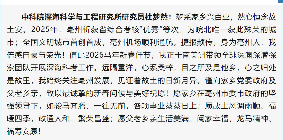 中国科学院深海科学与工程研究所研究员杜梦然正随团队在南美洲海域进行深渊科考。她在回信里写道:“目之所及是他乡,心之归处是故里。我始终关注亳州发展,见证着故土的日新月异。谨向家乡党委政府及父老乡亲,致以最诚挚的新春问候与美好祝愿!”这位从亳州走出去的女科学家,用一句嵌名联写祝福:“梦系家乡兴百业,然心恒念故土安。”
