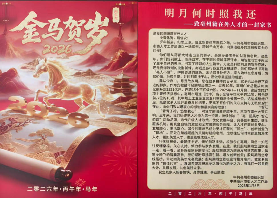 今年,亳州市再次向亳州籍在外优秀人才和本地高层次人才寄送“家书”。信纸不厚,分量却重。寥寥千余字,装得下过去一年这座城市的荣光:安徽省综合考核“优秀”等次、全国文明城市首创首成、亳州机场通航的轰鸣……却装不下亳州乡亲对远方游子的牵挂和祝福。