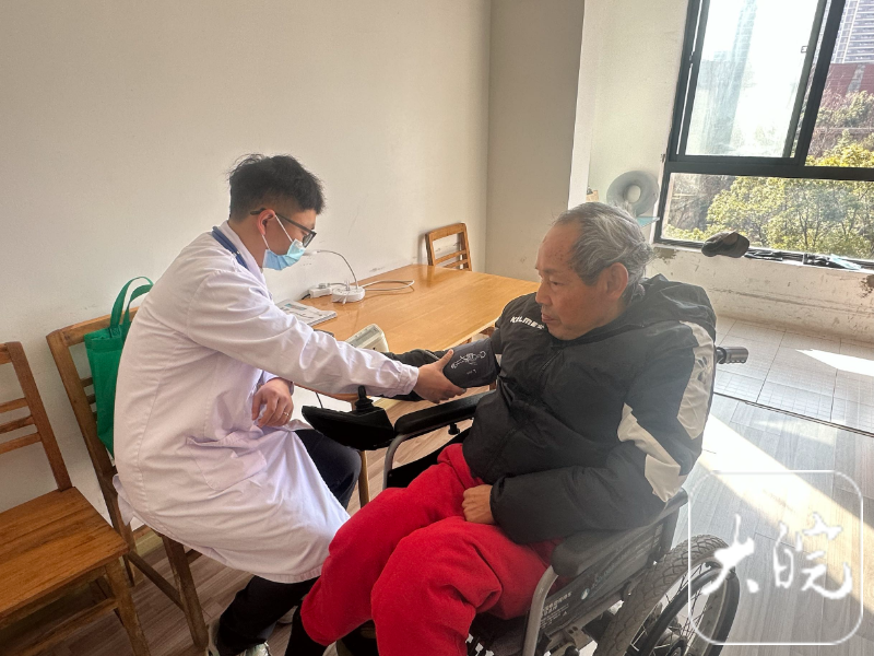 社区医生上门给程鸿全老人免费测量血压