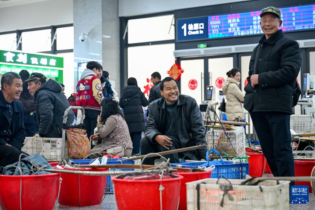 2月12日,在贵州省铜仁市铜仁站候车厅,来自湖南的菜农卖完果蔬后在一起交流。