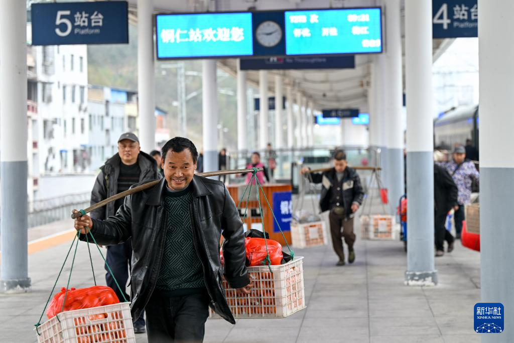 2月12日,在贵州省铜仁市铜仁火车站,村民挑着蔬果出站。