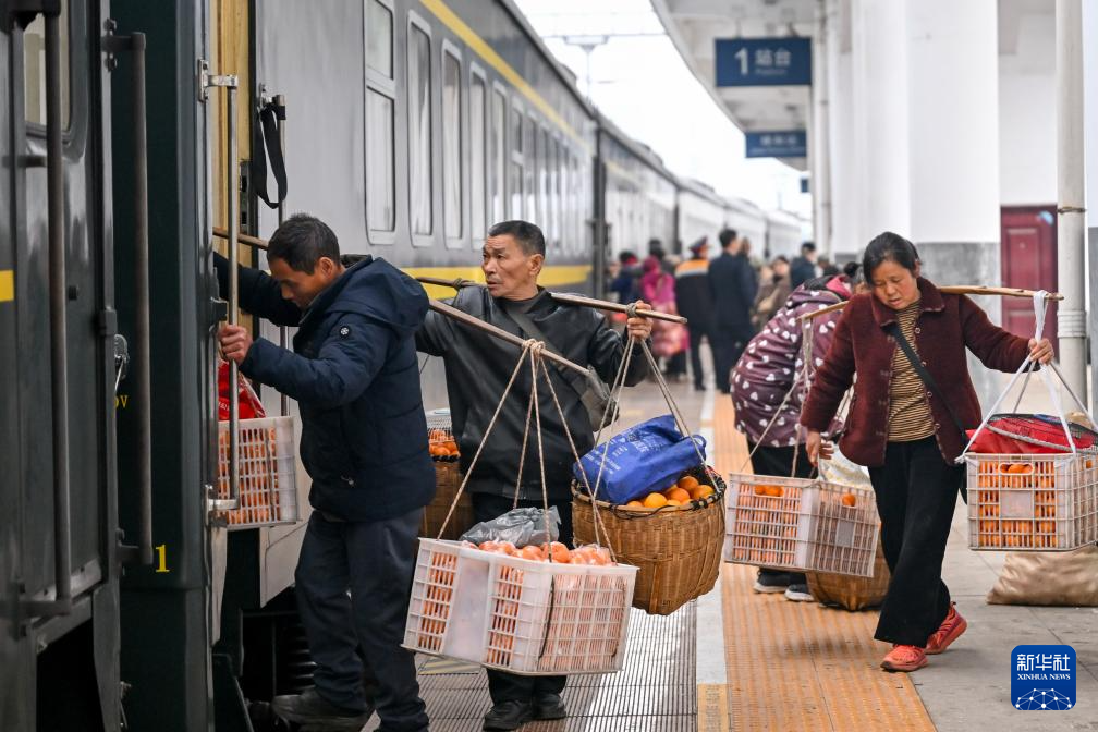 2月12日,村民挑着新鲜果蔬准备搭乘7272次公益性“慢火车”前往贵州铜仁。
