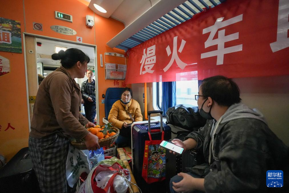 2月12日,村民带的新鲜水果摆放在7272次公益“慢火车”车厢过道。