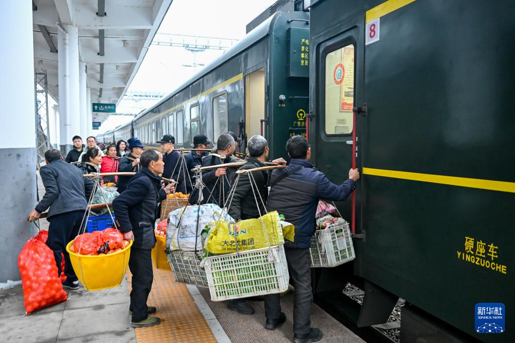 2月12日,7272次公益性慢火车停靠在湖南省锦和站,菜农挑着新鲜果蔬准备乘车运往贵州铜仁销售。