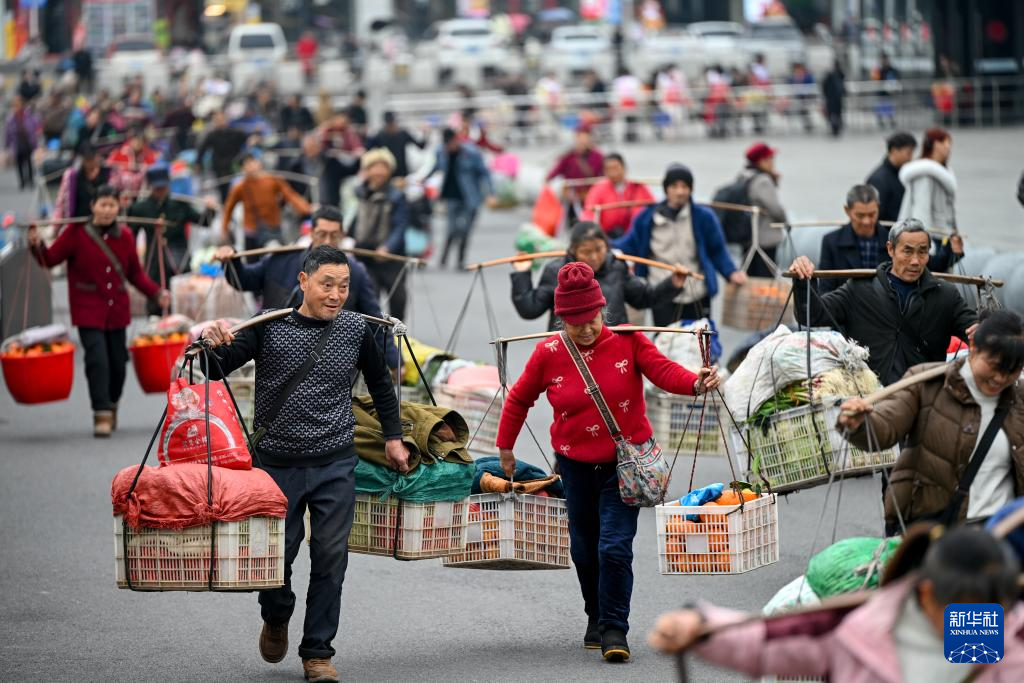2月12日,在贵州省铜仁市铜仁站,来自湖南的菜农挑着果蔬出站,准备前往附近的农贸市场进行销售。