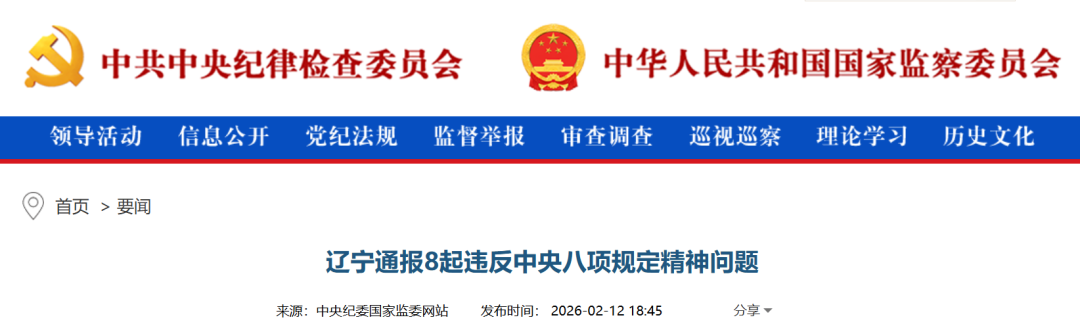 中央纪委国家监委网站2月12日消息,春节将至,为坚守节点,持续巩固拓展深入贯彻中央八项规定精神学习教育成果,驰而不息纠治“四风”、净化节日风气,营造崇廉尚俭、风清气正的节日氛围,辽宁省纪委监委现将近期查处的8起违反中央八项规定精神典型问题通报如下。