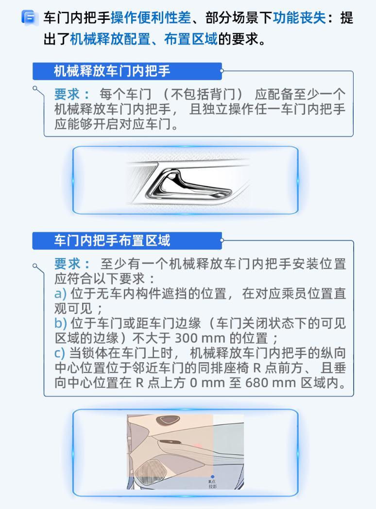 新国标最核心的三条“保命红线”,覆盖了极端情况下的逃生与救援需求,每一条都具有极强的针对性和可操作性,彻底解决了纯电子全隐藏式门把手“断电打不开、救援伸不进、紧急找不到”的致命问题。