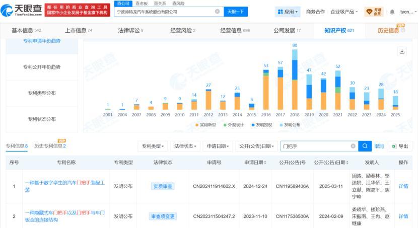 目前,已有多家车企提前布局,开始调整门把手设计,主动迎合新国标要求。据天眼查官网显示,国内多家汽车整车企业及核心零部件企业已提前布局车门把手安全相关技术研发,其中兴福赛、帅特龙等零部件企业已取得机械冗余开启的隐藏式拉手相关专利,江铃汽车、吉利等车企也斩获相关专利,头部企业的技术布局与新国标要求高度契合,成为行业向安全化转型的重要技术支撑。