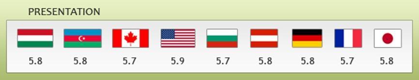 对于大型比赛,每个环节通常由九名裁判组成评审团,人数可以少于九人,但不得少于三人。他们“完全专注于评估每个动作的质量(技术分)和表演的质量(节目分)”