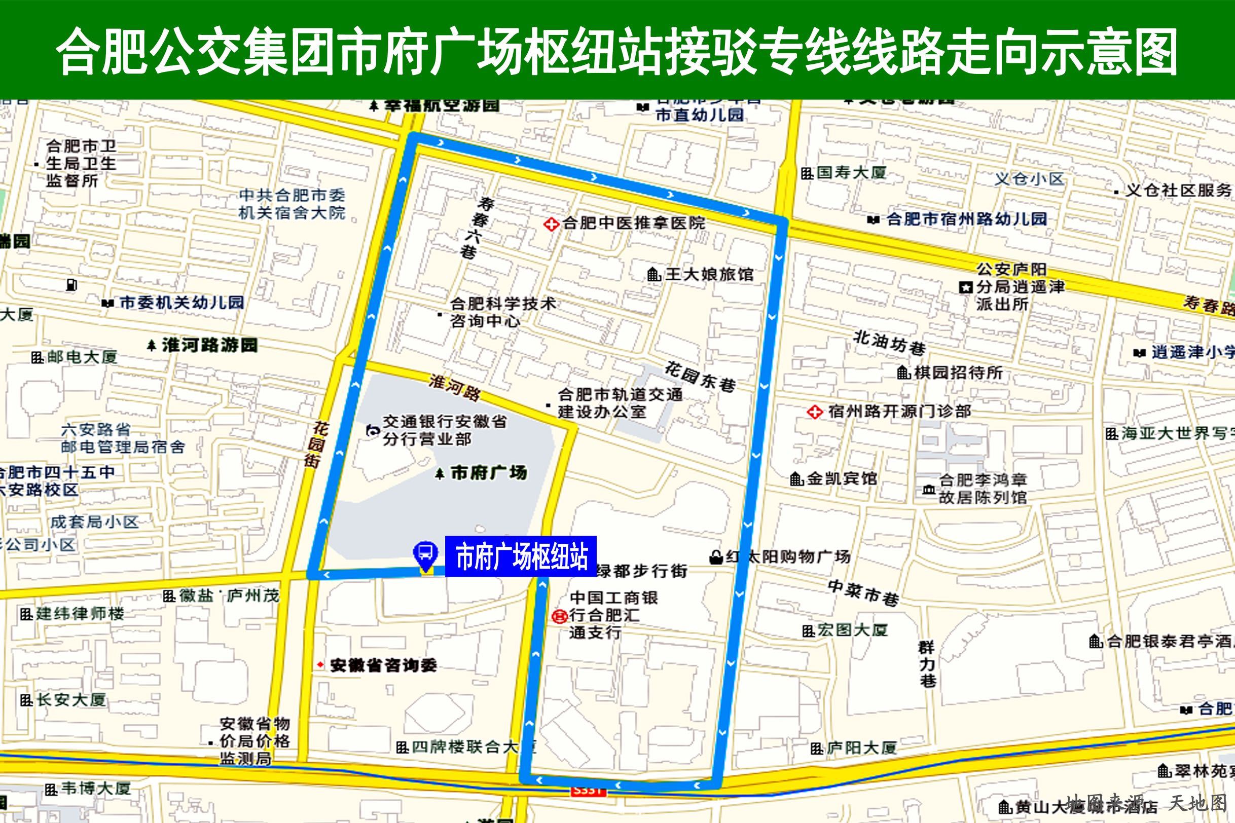 接驳专线线路走向:从“市府广场枢纽站”发车,经安庆路~阜阳路~寿春路~宿州路~长江中路~徽州大道~安庆路,抵达“市府广场枢纽站”。