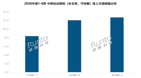 数据显示,2026年第1-6周,中国运动相机在京东、天猫、抖音等主要线上渠道的总销量达到33.1万台,销额高达7.9亿元,市场平均价格稳定在2376元的高位。