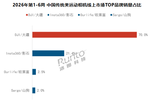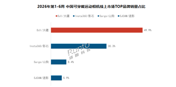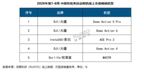 【CNMO科技消息】2月13日,根据洛图科技(RUNTO)最新发布的《中国运动相机线上零售市场周度追踪》报告,在涵盖元旦及春节假期的第1-6周(2025.12.29-2026.02.08),中国运动相机线上零售市场表现亮眼。