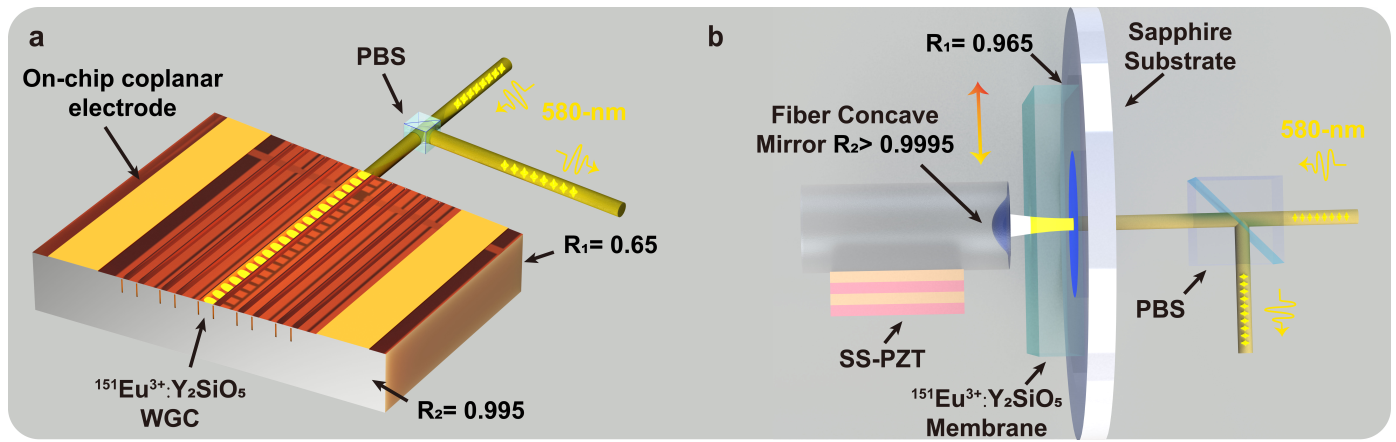 团队研究人员称,面对这一挑战,中国科大团队独辟蹊径,构建了基于“阻抗匹配微腔”的全新量子存储架构。研究团队基于掺铕硅酸钇晶体设计了两种新型的微腔增强量子存储器:一种是利用激光在晶体内部雕刻光波导,镀膜形成波导腔;另一种则将晶体薄膜耦合开放式的光纤微腔。