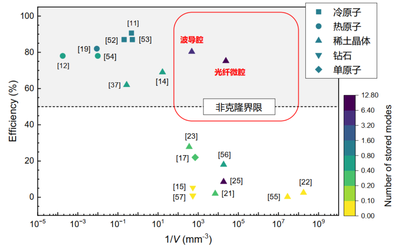 量子存储器的效率及装置体积对比,红框圈出的是本成果的结果。