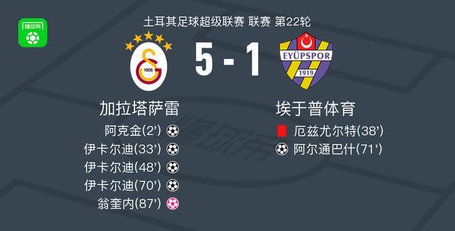 北京时间2月14日土耳其足球超级联赛 联赛 第22轮,加拉塔萨雷主场对阵埃于普体育。加拉塔萨雷阿克金破门,伊卡尔迪帽子戏法。埃于普体育阿尔通巴什破门,翁奎内自摆乌龙。最终比分加拉塔萨雷 5-1 埃于普体育。