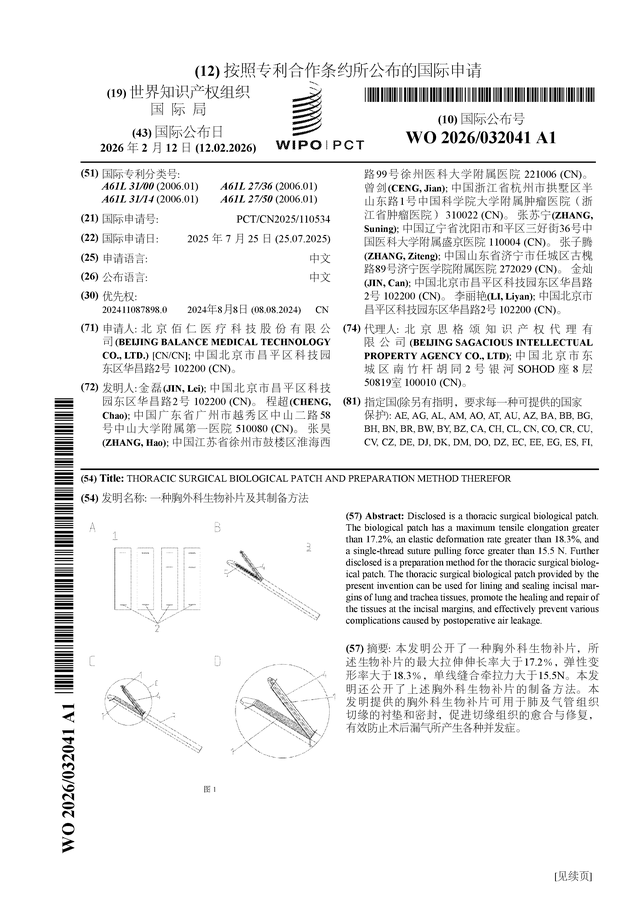 证券之星消息,根据企查查数据显示佰仁医疗(688198)公布了一项国际专利申请,专利名为“一种胸外科生物补片及其制备方法”,专利申请号为PCT/CN2025/110534,国际公布日为2026年2月12日。
