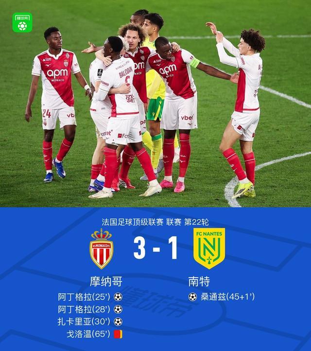 北京时间2月14日法国足球甲级联赛第22轮,摩纳哥主场对阵南特。比赛中,摩纳哥球员阿丁格拉先后两次打入进球,扎卡里亚也成功破门;南特球员桑通兹在对方球员的助攻下打入一球。此外,摩纳哥一名球员在比赛中累计吃到两张黄牌。最终,摩纳哥以3比1的比分战胜南特。