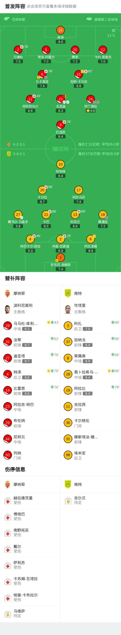 第45分钟,扳回一球,桑通兹后点抽射破门,南特1-3摩纳哥