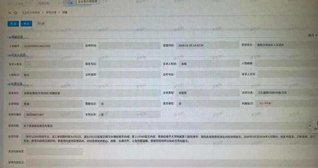 南华大学附属第三医院已将该工单内容在院内通报表扬。从冰冷编码到温热感激,从投诉汪洋到表扬孤岛。这条工单,最终抵达的不只是政府平台,更是人心。