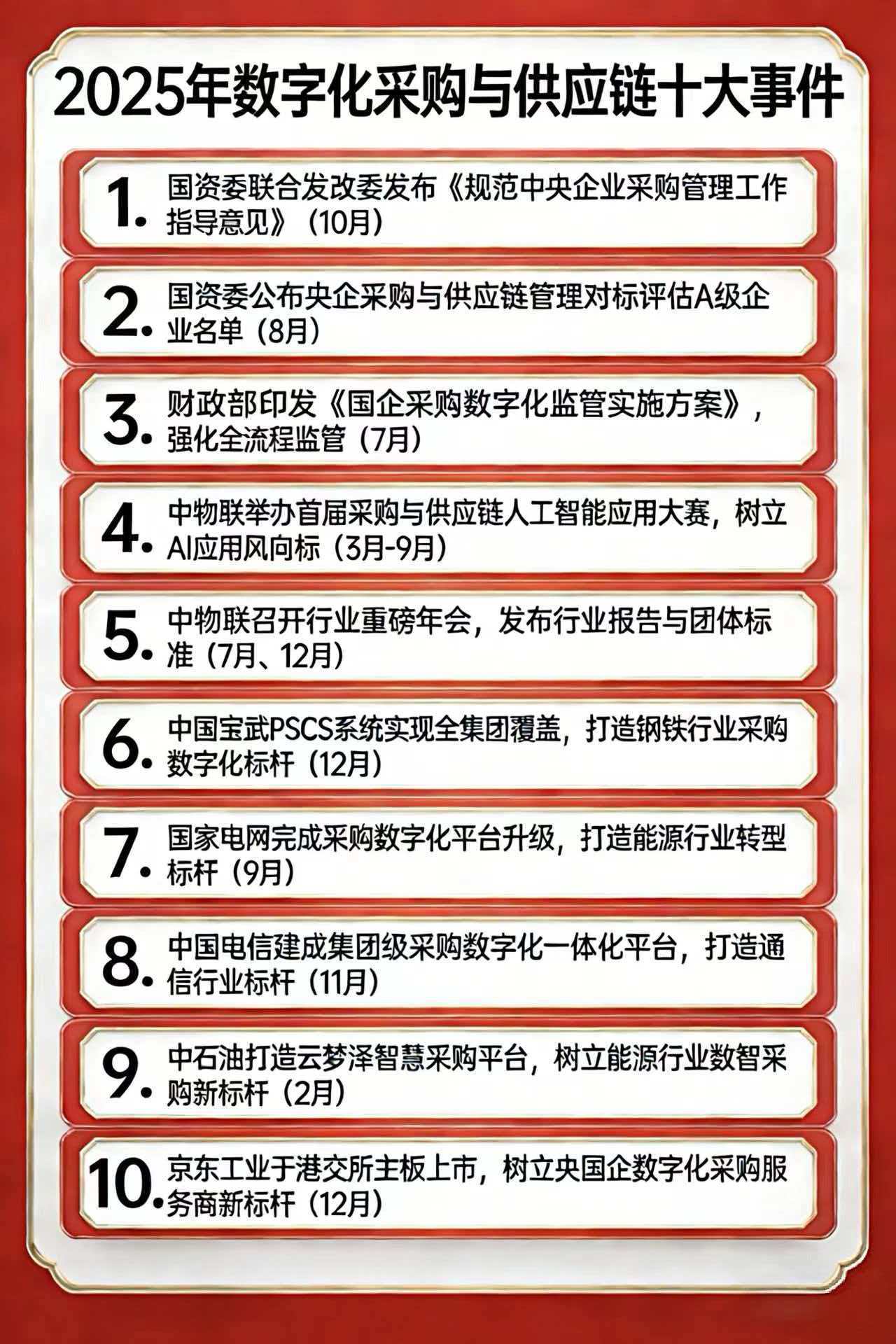 行业意义:成为2025-2026年央企采购转型的“顶层设计”,直接影响97家央企、万亿级采购市场,推动行业从“合规驱动”向“价值驱动”全面升级,所有后续事件均围绕此意见落地推进,奠定全年行业发展基调。