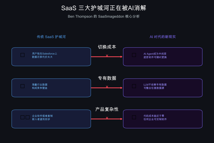 Ben Thompson的SaaSmageddon分析、Benedict Evans的冷静审视、华尔街2850亿美元的恐慌、Salesforce/ServiceNow/Workday的自救转型——这些碎片拼在一起,描绘出一幅清晰的图景: