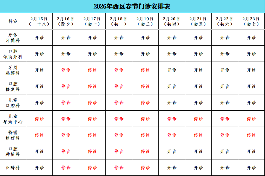 【西院区】2月15日-18日(腊月二十八至初二)停诊;2月19日-23日(初三至初七)正常开诊。