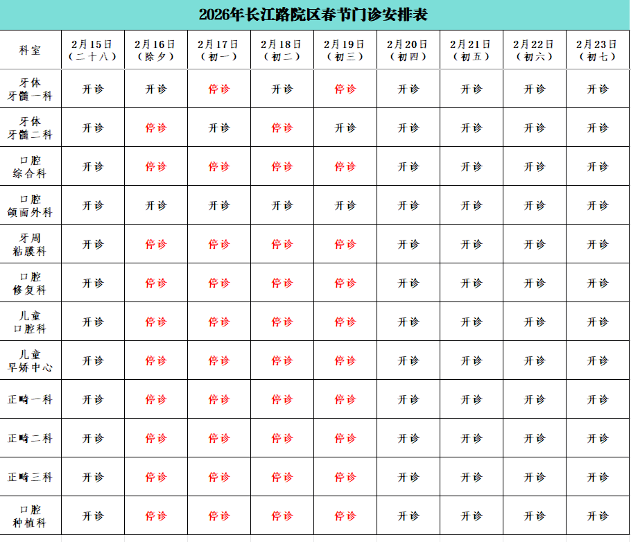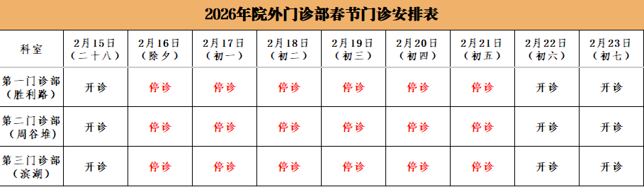 【长江路门诊】2月16日-2月19日(除夕至正月初三)门诊停诊。2月15日(腊月二十八)、2月20日(正月初四)-2月23日(正月初七),按门诊原排班正常应诊。2月15日-2月23日(腊月二十八至正月初七)妇科阴道镜门诊、简易门诊停诊。