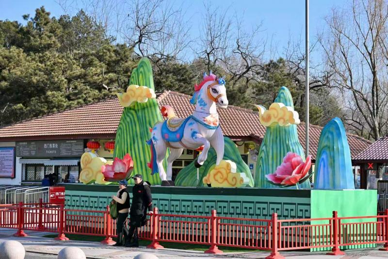 为烘托喜庆热烈的节日氛围,玉渊潭公园精心布置了主题花境3组,悬挂各式灯笼3000余个,各类装饰约80处。东门区域特别打造了以玉渊亭和中堤桥为主题的可步入式大型景观,西门外的大型骏马花灯成为晚间西三环一道亮丽的风景。主要景区、园路配以红灯笼、宫灯、道旗等进行装饰点缀。华灯初上,园内醒狮、鲲鹏等造型的花灯与波光粼粼的湖面交相辉映,绚烂光影载满人们对新年的美好祈愿,与游园欢趣交织成记忆中一幅温暖明亮的年画。
