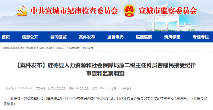 旌德县人力资源和社会保障局原二级主任科员曹建民涉嫌严重违纪违法,目前正接受旌德县纪委监委纪律审查和监察调查。(旌德县纪委监委)