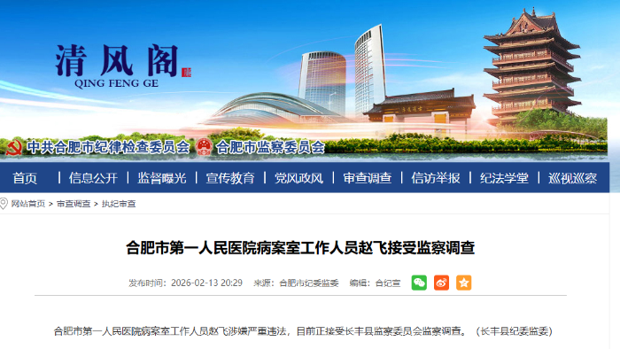 合肥市第一人民医院病案室工作人员赵飞涉嫌严重违法,目前正接受长丰县监察委员会监察调查。(长丰县纪委监委)