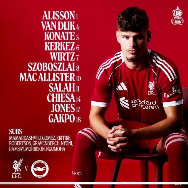 利物浦首发:1-阿利松、8-索博斯洛伊、4-范戴克、5-科纳特、6-凯尔凯兹、17-柯蒂斯-琼斯、7-维尔茨、10-麦卡利斯特、11-萨拉赫、14-费代里科-基耶萨、18-加克波