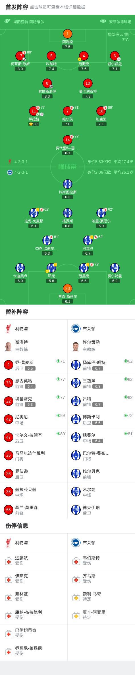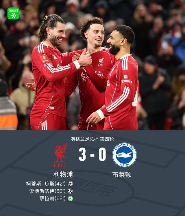 北京时间2月15日4:00,足总杯第四轮继续进行,利物浦坐镇安菲尔德球场迎战布莱顿,本场主裁判为阿特维尔。上半场,凯尔凯兹助攻琼斯破门。下半场,萨拉赫助攻索博斯洛伊破门后自己又点射建功。最终,利物浦3-0完胜布莱顿,晋级足总杯16强。