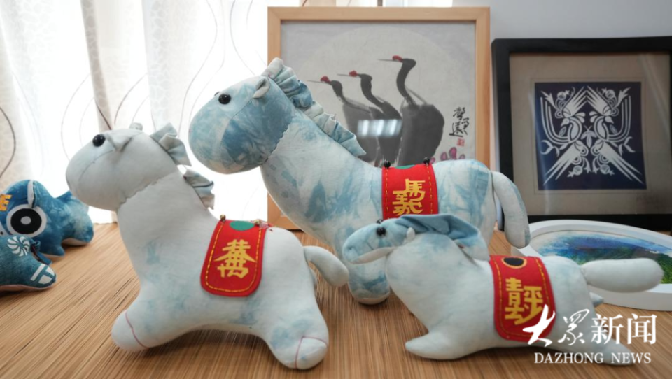 “这些扎染都是我自己手工扎染,蓝印花的纹样则是我自己刻版印染的,传统的东西简洁大方,正成为一种新的潮流。”刘培宗介绍。事实证明,他的创新“押对了宝”,这款蓝印花布偶生肖马一经推出就备受追捧,到目前为止已经销售了1000多件,成为了当之无愧的“爆款”。