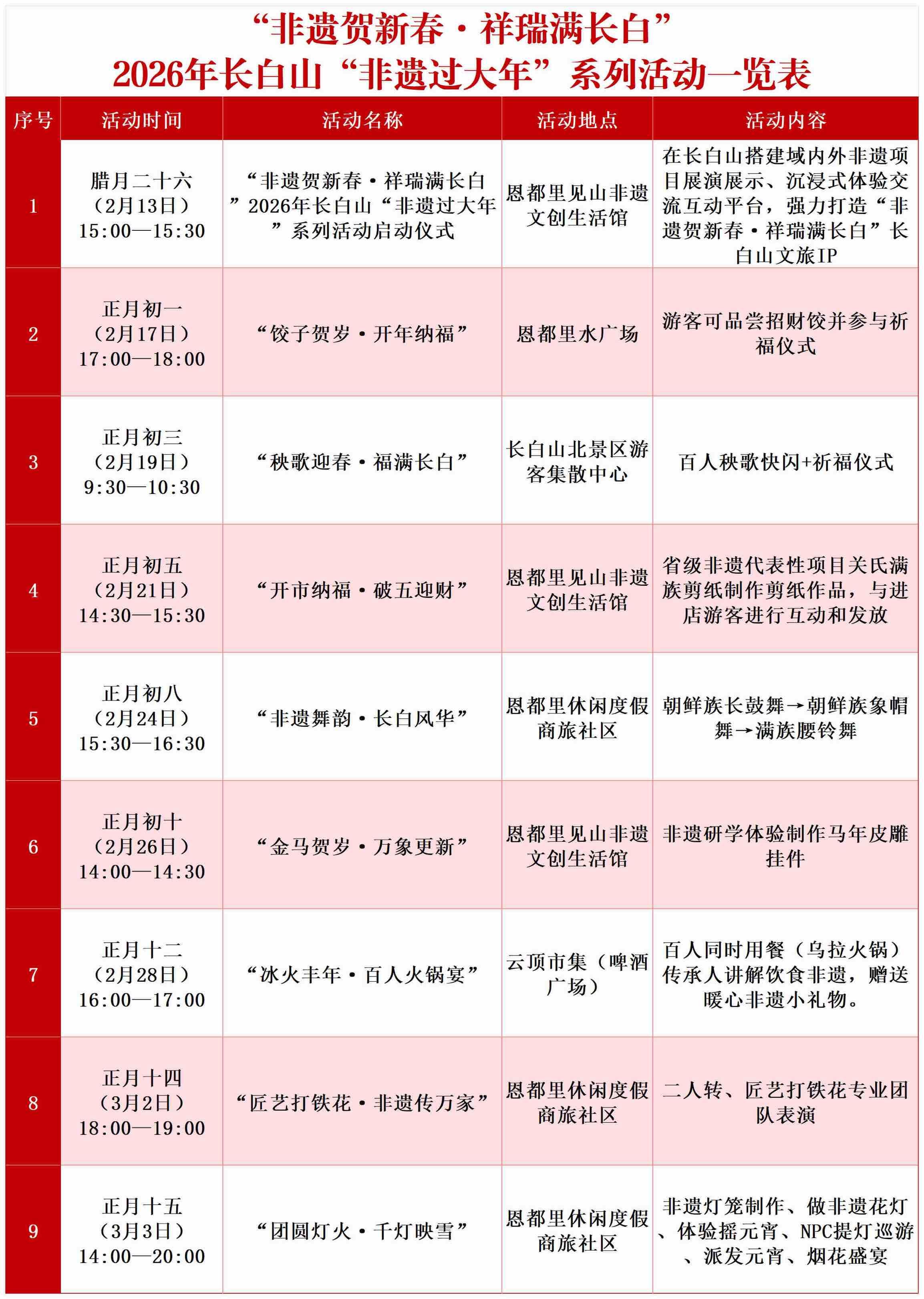 2月25日(正月初九)10时,新春市集开市,非遗展演同步开展;13时至15时30分,在吉林市人民大剧院2号厅举办东路二人转精品文艺晚会。