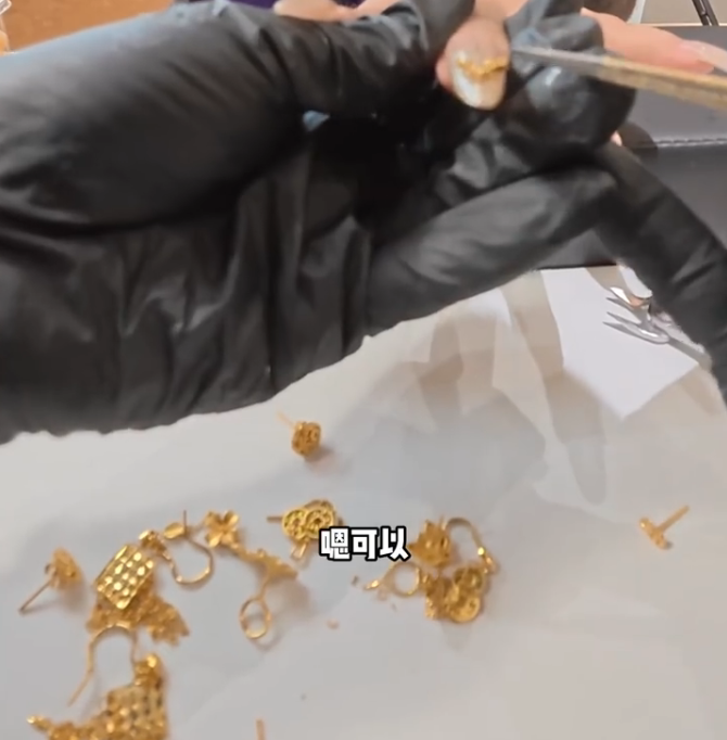 “金饰的简单拆剪我们可以完成,但有些项链、耳环需要去金店专门分拆后,再带来做美甲。”采访中,多名美甲师均告诉记者,顾客带来的金饰多为老庙黄金的金花耳钉、中国黄金的蝴蝶花朵项链等知名品牌的金饰。