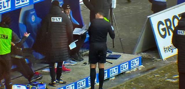 主裁判阿萨德-努胡姆立即作出反应,暂缓比赛开始,并将助理裁判叫到身边了解情况。两人随后走向罗斯托克替补席区域沟通处理。亚格奇在确认身体无碍后,简单清理头部积雪,表示可以继续执法。现场也通过广播呼吁球迷保持冷静。
