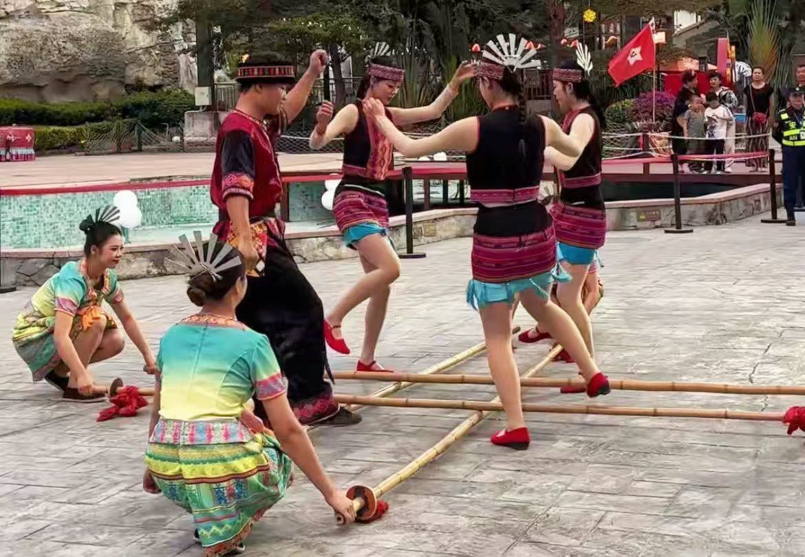 别以为打柴舞只是随意蹦跳,它其实大有讲究。基本步伐就分为:单脚跳、双脚跳和转身跳等好多种。但真正跳起来,可不简单——要在竹竿开合的瞬间精准落步,慢了会被夹住脚,快了又会踩空。我第一次上场尝试,才跳了两步就被竹竿“逮”个正着,鞋子都飞了出去,差点儿摔倒,周围人都哈哈大笑。说来也奇怪,被笑了也不觉得难为情,反而跟着笑起来——大概这就是黎族打柴舞的魔力,它让人不自觉地卸下拘谨,融入这份纯粹的欢喜。
