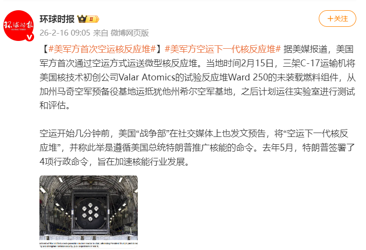 环球时报援引美媒报道,美国军方首次通过空运方式运送微型核反应堆。当地时间2月15日,三架C-17运输机将美国核技术初创公司Valar Atomics的试验反应堆Ward 250的未装载燃料组件,从加州马奇空军预备役基地运抵犹他州希尔空军基地,之后计划运往实验室进行测试和评估。