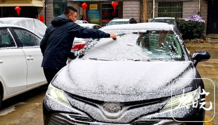 大皖新闻讯 2月16日(农历除夕)上午8时许,淮南市龙湖汇景小区内,一名男子正细心清理车窗上的积雪,为新春出行做准备。