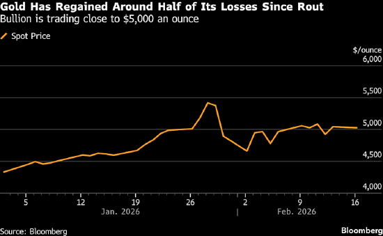 1月下旬,受大量投机买盘推动,黄金涨至多年牛市的临界点,一度飙升至每盎司5595美元以上的历史高位。但在月初经历了为期两天的突然暴跌,金价回落至4500美元下方,此后在震荡行情中收复了约一半的跌幅。