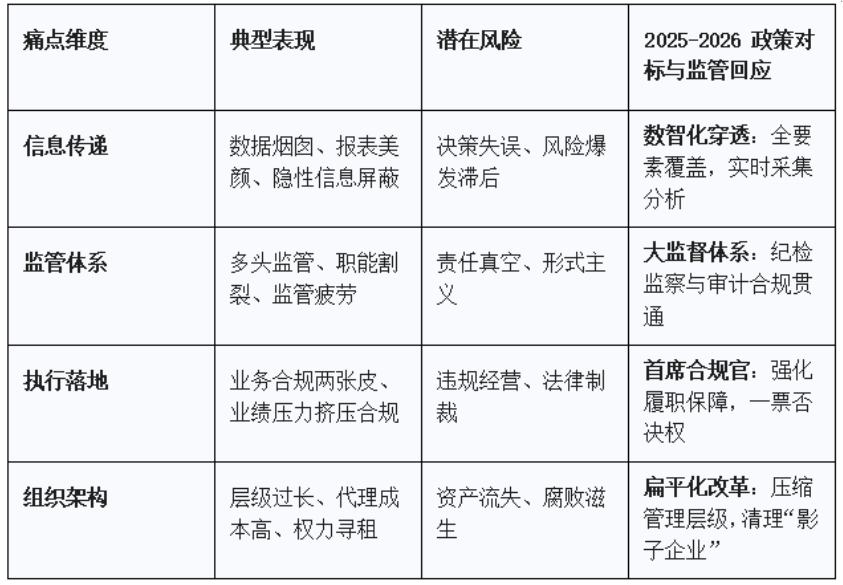 1.监管职能必须垂直化:必须剥离基层企业对合规、审计、纪检人员的人事任免权和薪酬考核权,实行派驻制或垂直管理。