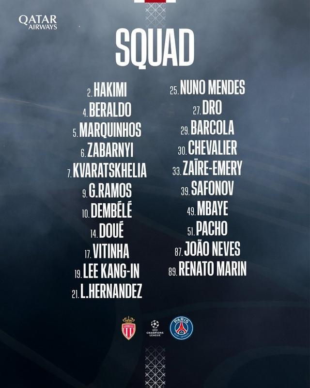 前锋:7-克瓦拉茨赫利亚、9-贡萨洛-拉莫斯、10-登贝莱、14-杜埃、29-巴尔科拉、49-姆巴耶