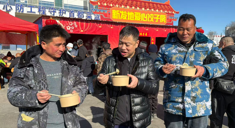 闻讯而来的商户们很快排起长队,大家笑着和同行们打着招呼,有的商户坐在饺子屋边上的小暖棚里吃饺子。“大葱大王”毛勇习端着碗,咬了一口韭菜鸡蛋馅的饺子,眼睛一亮:“就是这个味儿!市场年年记得我们爱吃什么,暖心!”一旁的“圆茄大王”杨蒙捧着热饺子,感慨万千:“从在新发地打工,到现在自己当老板,这碗饺子吃了二十多年,也是家的感觉。”