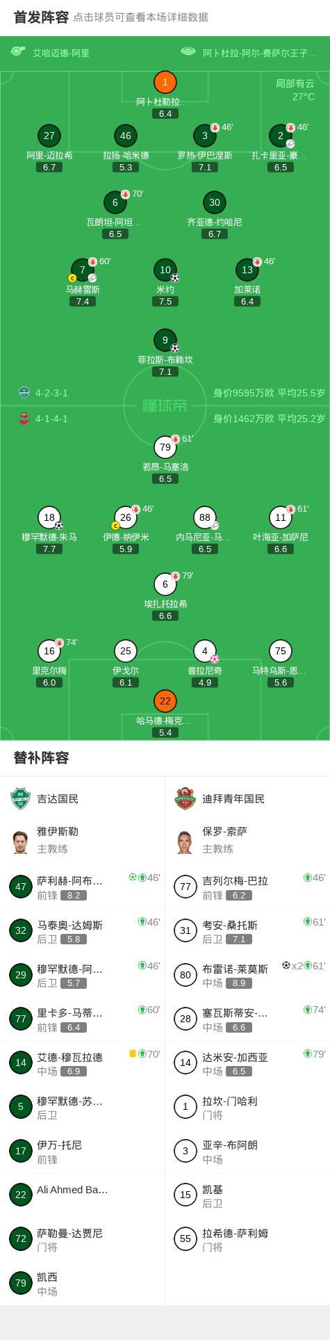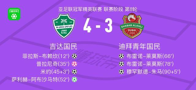 北京时间2月17日亚足联冠军精英联赛 联赛阶段 第8轮,吉达国民对阵迪拜青年国民。吉达国民菲拉斯-布赖坎破门,米约破门,萨利赫-阿布沙马特破门。迪拜青年国民布雷诺-莱莫斯梅开二度,穆罕默德-朱马破门,普拉尼奇自摆乌龙。最终比分吉达国民 4-3 迪拜青年国民。
