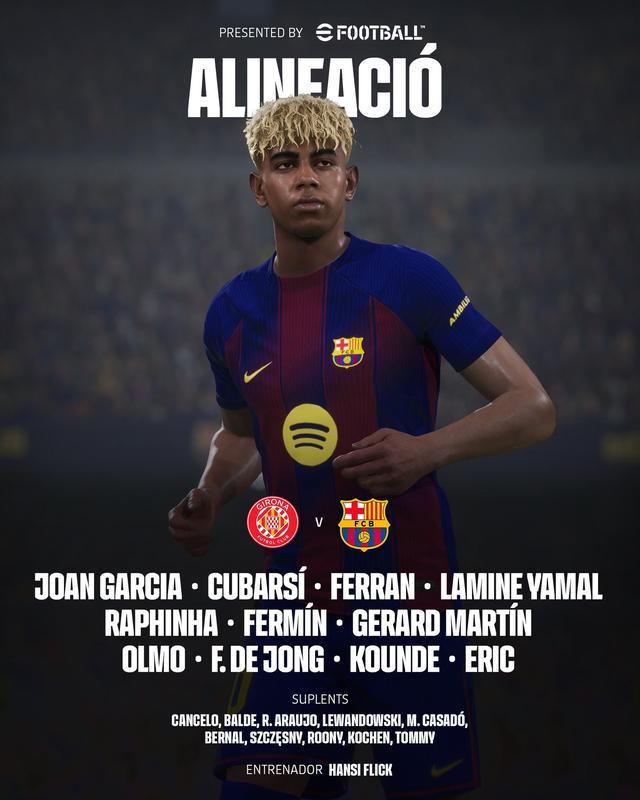 巴塞罗那首发:13-霍安-加西亚、23-孔德、18-赫拉德-马丁、5-库巴西、24-埃里克-加西亚、16-费尔明-洛佩斯、21-弗朗基-德容、20-奥尔莫、11-拉菲尼亚、10-亚马尔、7-费兰-托雷斯