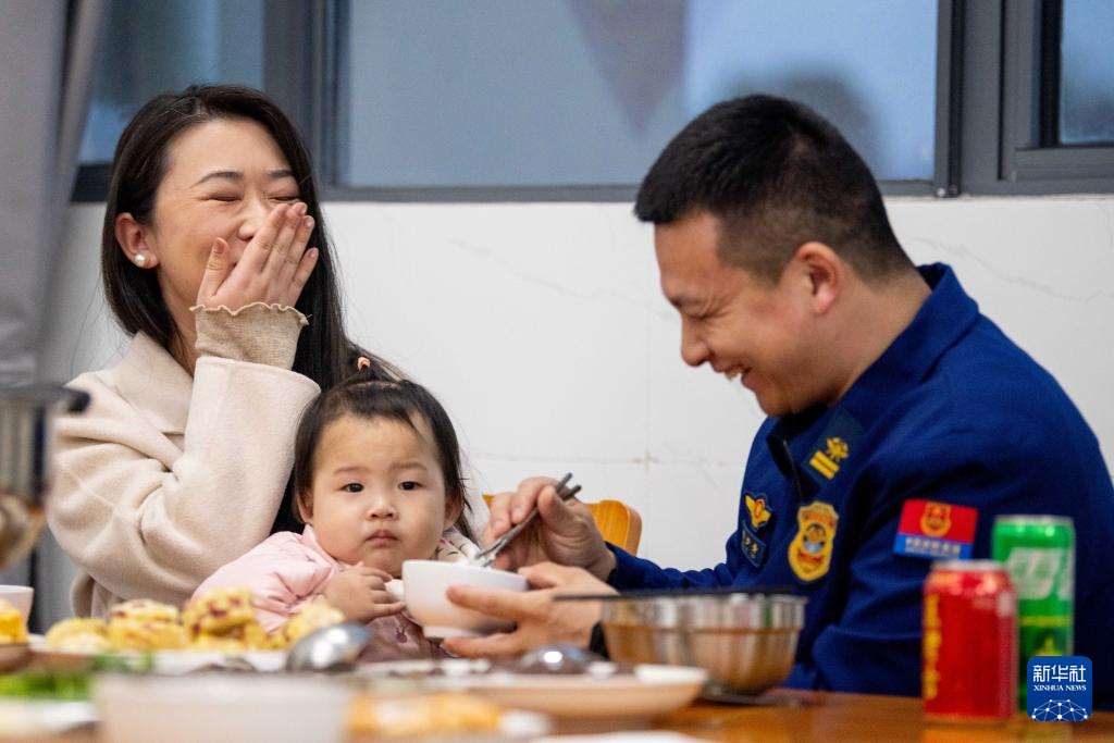 2月16日,在江苏省泰兴市澄江西路消防救援站,消防员和家属一起吃团圆饭。