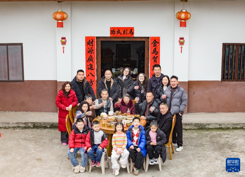 2月16日,在四川省南充市顺庆区清平村,村民陈俊尧一家祖孙四代吃团年饭。
