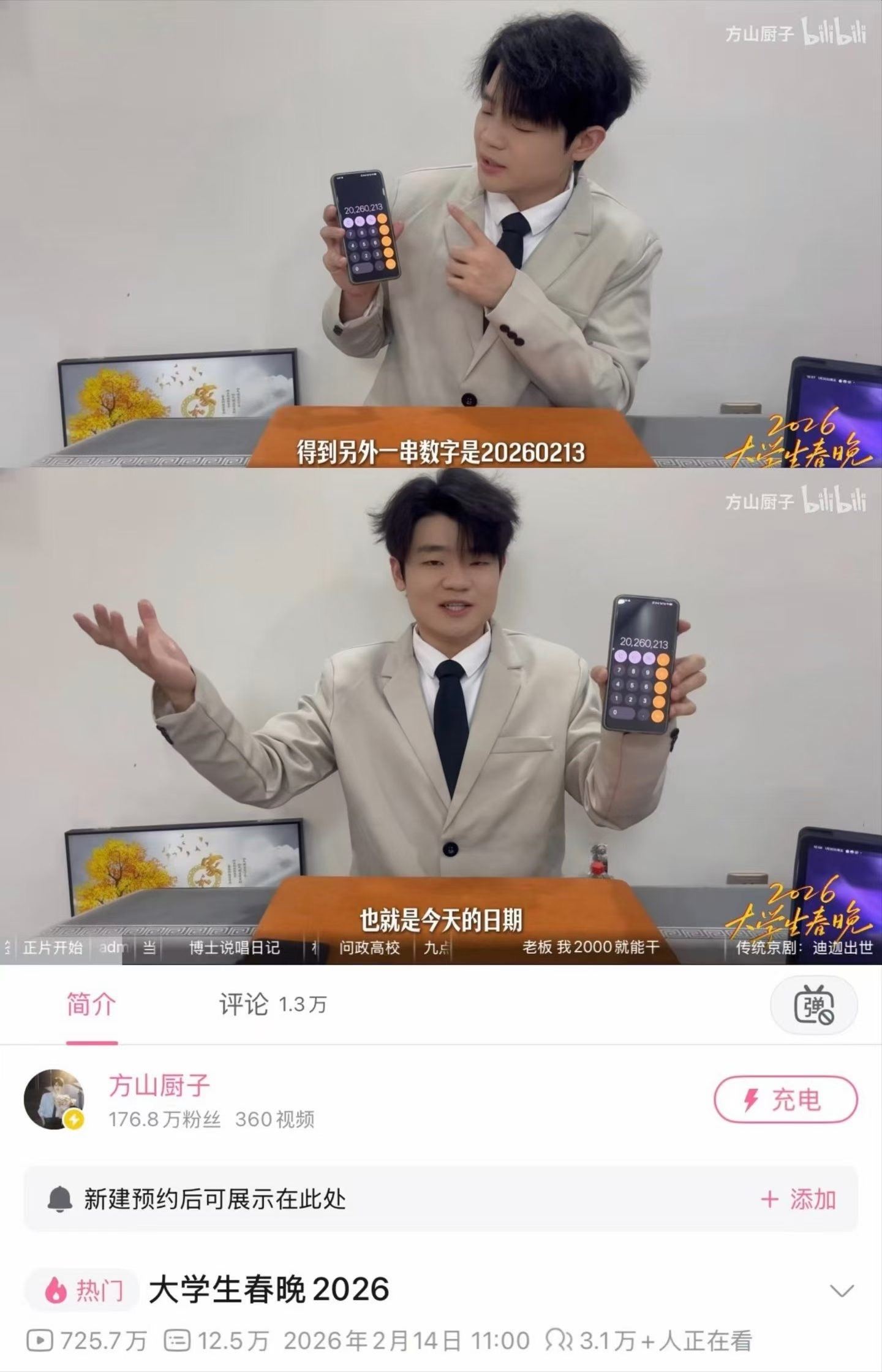 次日,“大学生春晚”导演“方山厨子”发布视频并配文:对不起邓男子老师,大学生春晚不小心押中题了。在视频中,一位大学生魔术师在“2026大学生春节联欢晚会”中同样拿出计算器变出了与晚会当天对应的一串数字“20260213”。